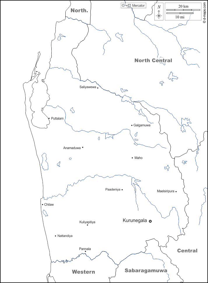 d-maps > Asia > Sri Lanka > Provincia Nord-Occidentale > frontiere, idrografia, principali città, nomi, bianco