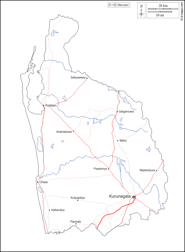 d-maps > Asia > Sri Lanka > Provincia Nord-Occidentale > contorni, idrografia, principali città, strade, nomi, bianco