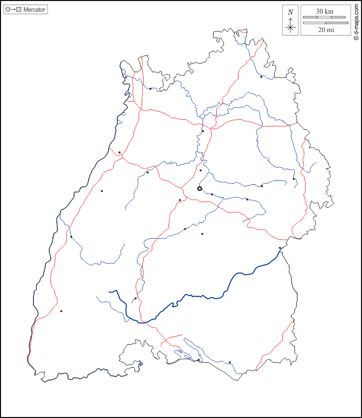 d-maps > Europa > Germania > Stato del Baden-Württemberg > contorni, idrografia, principali città, strade, bianco