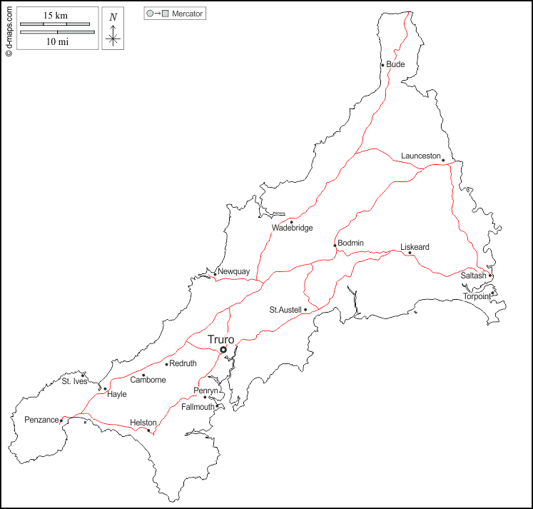 d-maps > Europa > Regno Unito > Cornwall > contorni, principali città, strade, nomi, bianco