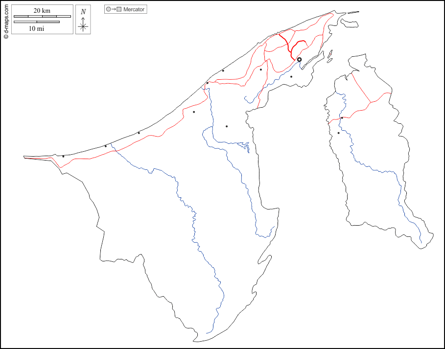 d-maps > アジア > ブルネイ > 輪郭, 川と湖, 主要都市, 道路, 白い