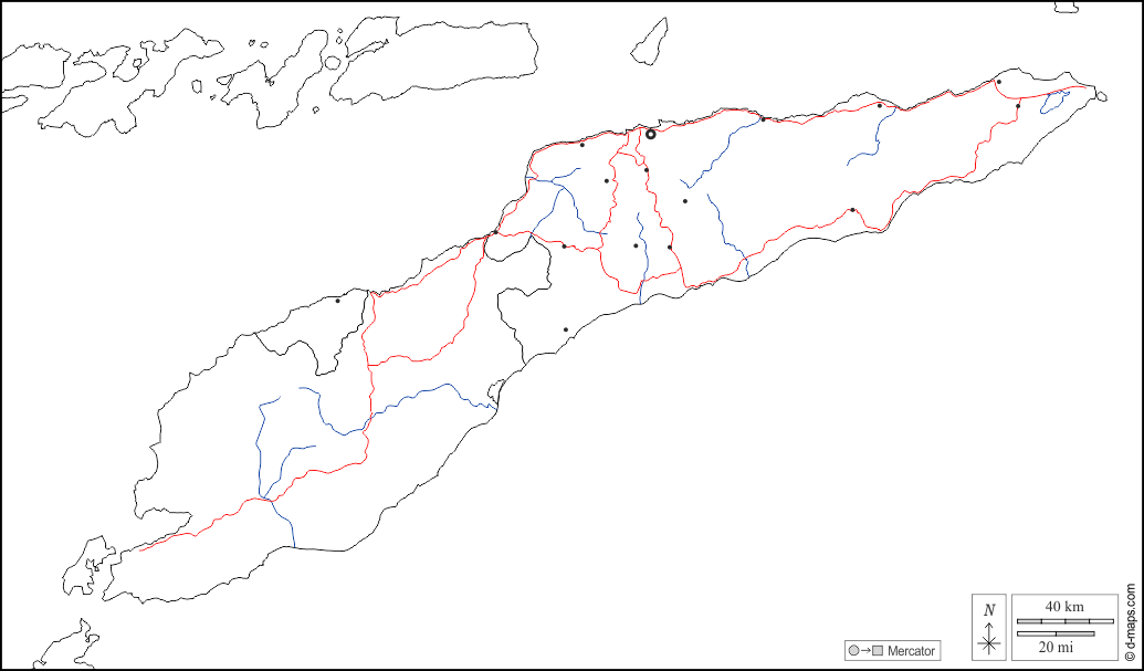 d-maps > アジア > 東ティモール > 境界, 川と湖, 主要都市, 道路, 白い