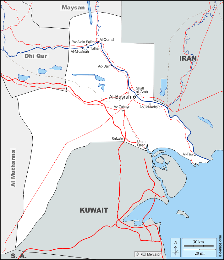 'Az Aldin Salim - Abu al-Kahsib - Ad-Dair - Al-Basrah - Al-Faw - Al-Midainah - Al-Qurnah - Az-Zubayr - Safwan - Shatt al-'Arab - Talhah - Umm Qasr