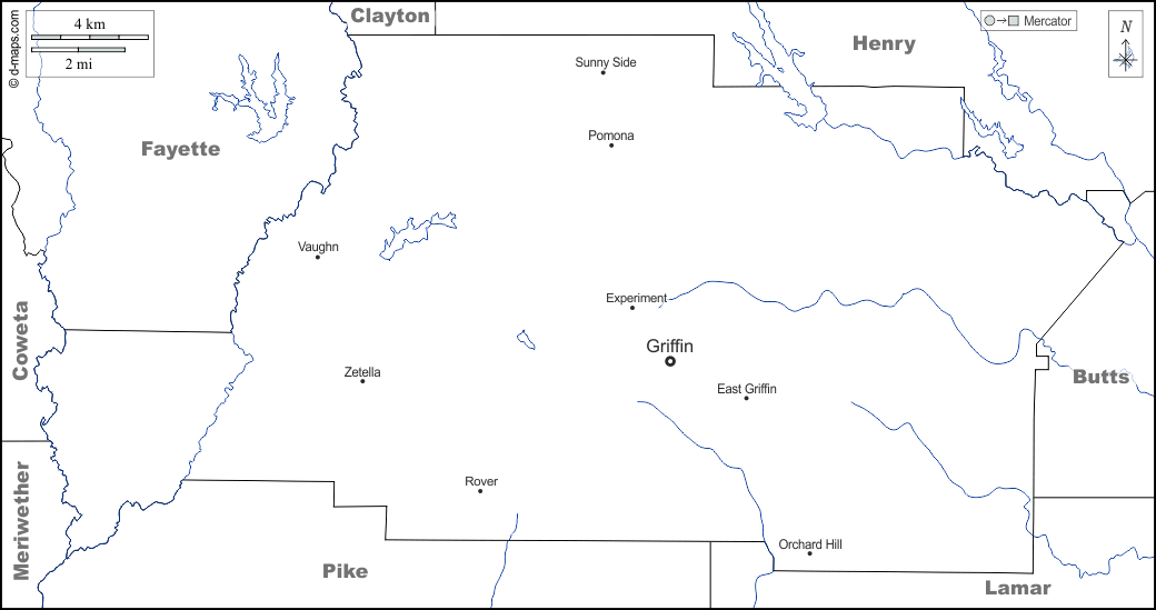 d-maps > Estados Unidos da América (USA) > Geórgia > Condado de Spalding > fronteiras, hidrografia, principais cidades, nomes, branco