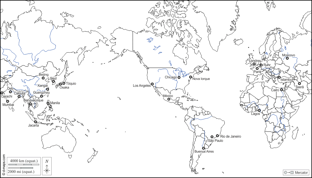 d-maps > Mundo e oceanos > Planisfério Mundo (Américas) > hidrografia, estados, principais cidades, nomes, branco