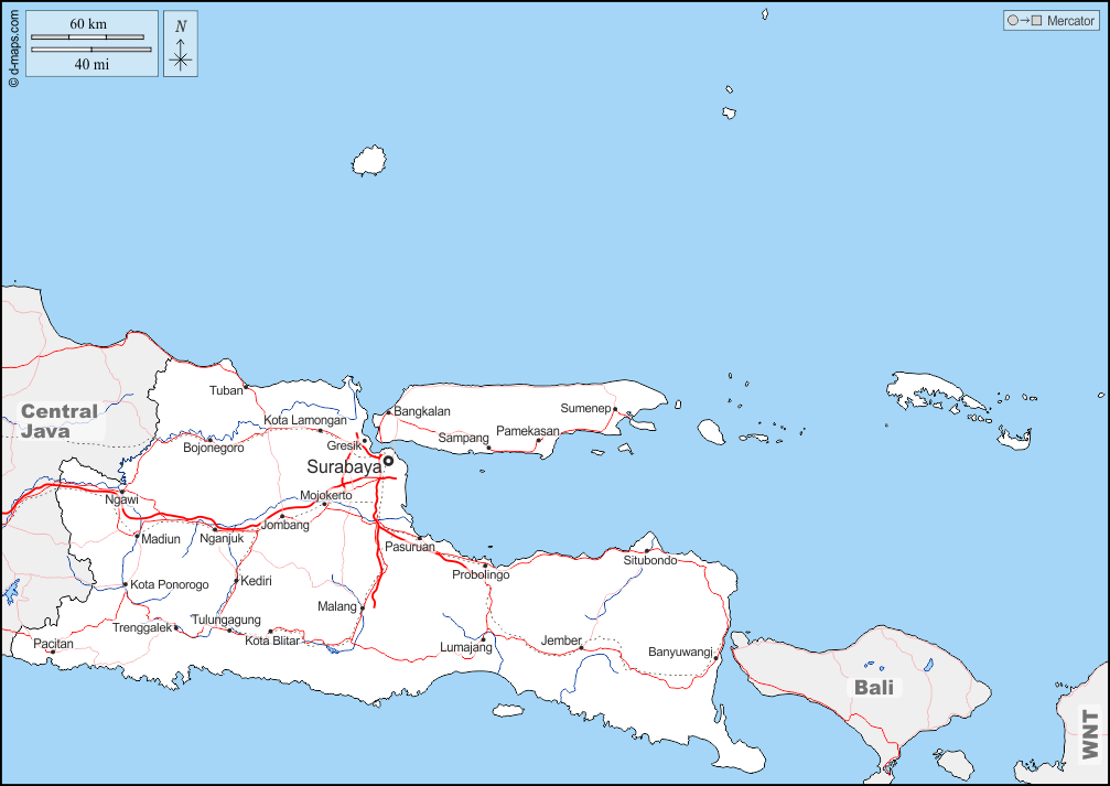 d-maps > Ásia > Indonésia > Java Oriental > fronteiras, hidrografia, principais cidades, estradas, nomes