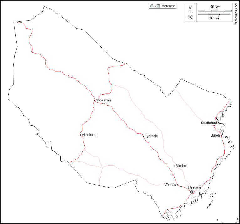 d-maps > Europa > Suécia > Bótnia Ocidental > contornos, principais cidades, estradas, nomes, branco