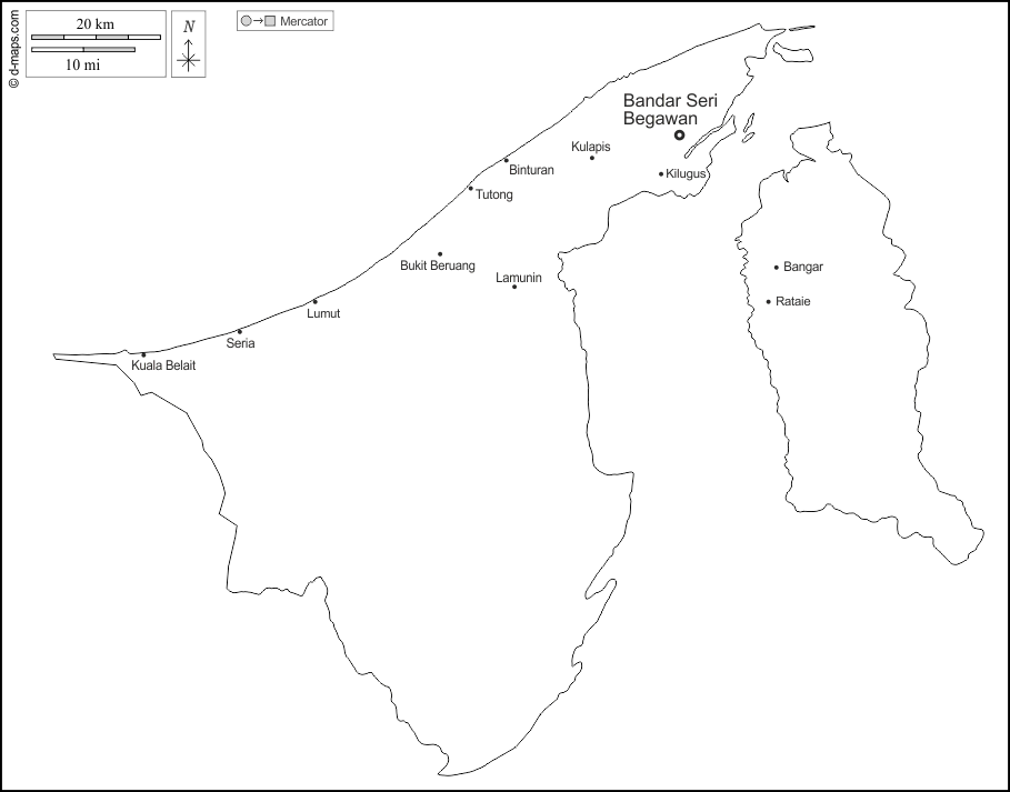 d-maps > Ásia > Brunei > contornos, principais cidades, nomes, branco