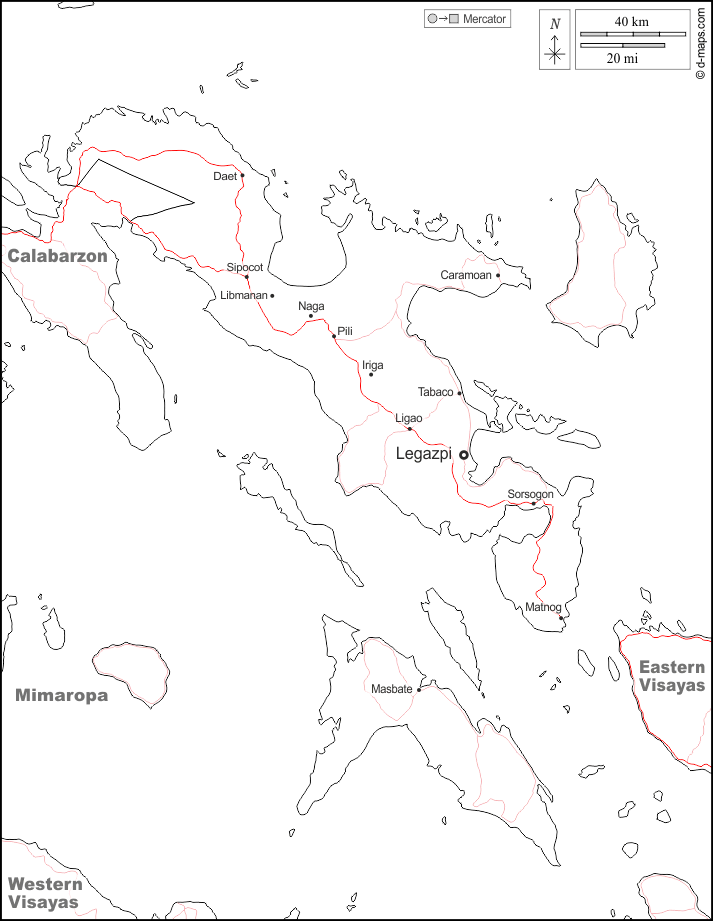 d-maps > Ásia > Filipinas > Bicol > fronteiras, principais cidades, estradas, nomes, branco