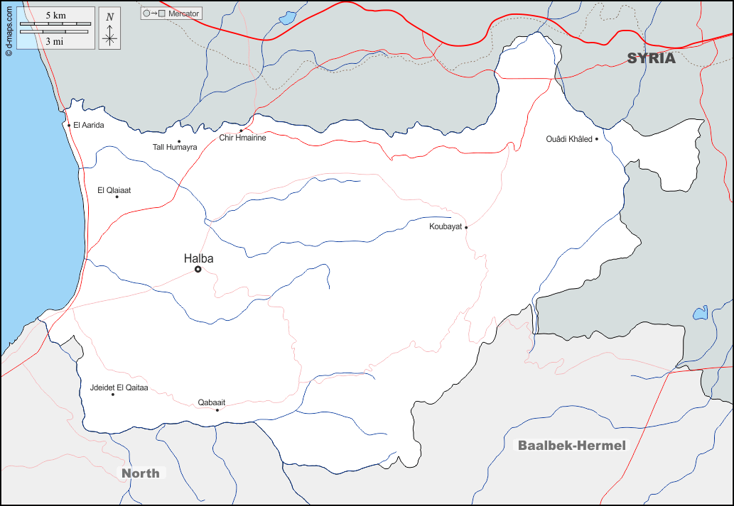 d-maps > Ásia > Líbano > Akkar > fronteiras, hidrografia, principais cidades, estradas, nomes