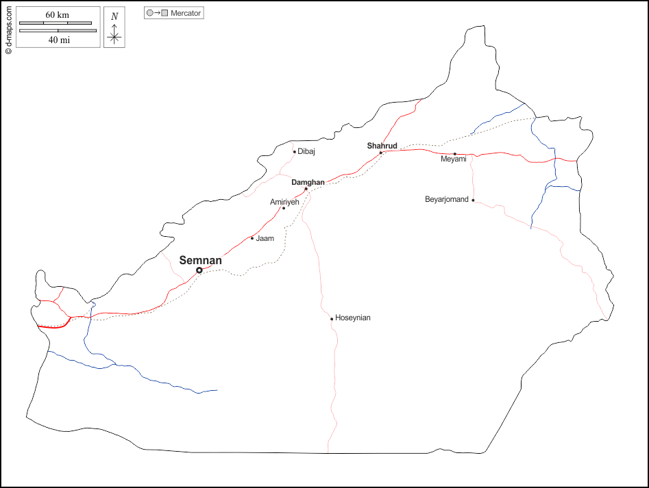 d-maps > Ásia > Irão > Semnã > contornos, hidrografia, principais cidades, estradas, nomes, branco