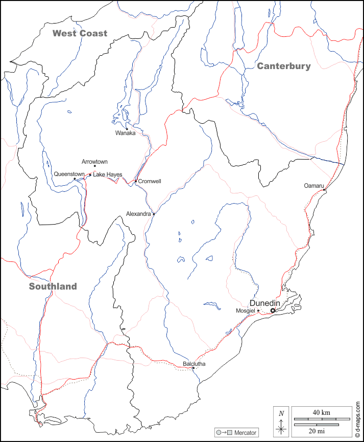 Oceânia > Otago > fronteiras, hidrografia, principais cidades, estradas, nomes, branco