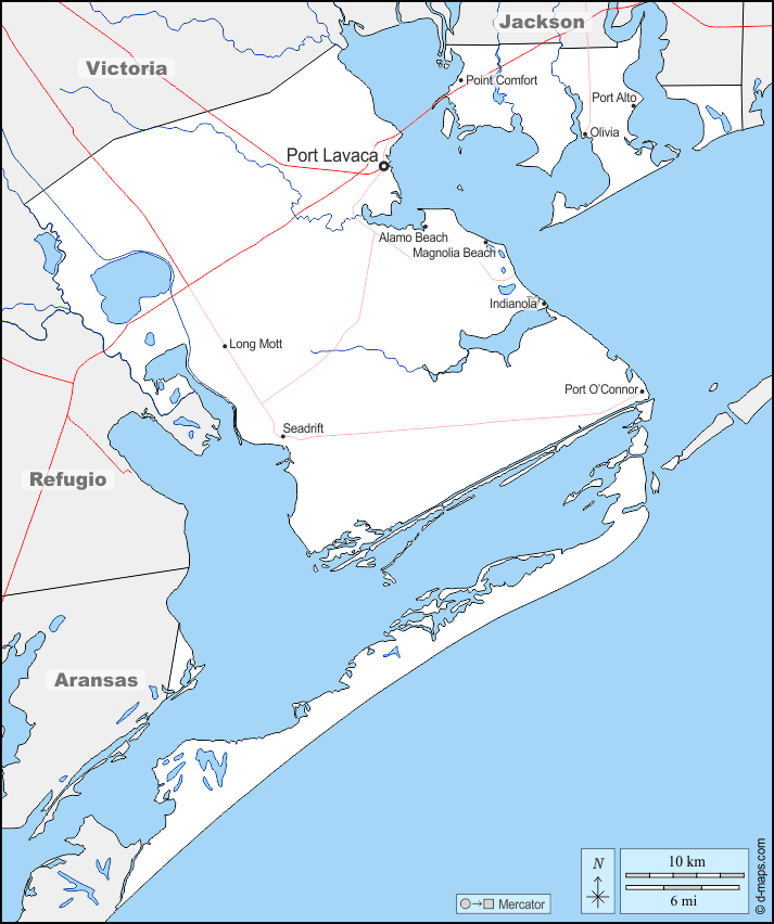 d-maps > Соединённые Штаты Америки > Техас > Калхоун > границы, гидрографии, Главные города, дорог, имена
