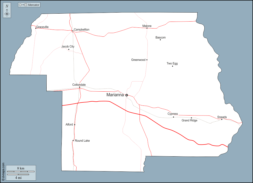 d-maps > Соединённые Штаты Америки > Флорида > Округ Джексон > контур, Главные города, дорог, имена