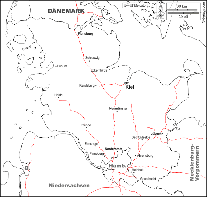 d-maps > Европа > Германия > Земля Шлезвиг-Гольштейн > границы, Главные города, дорог, имена, Белый