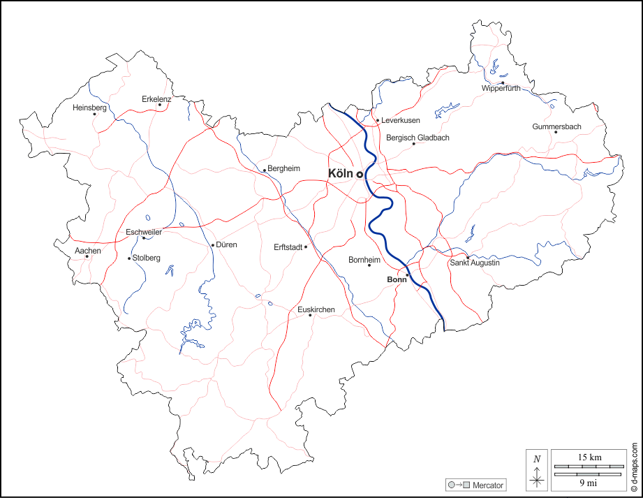 d-maps > Европа > Германия > Административный округ Кельн > контур, гидрографии, Главные города, дорог, имена, Белый