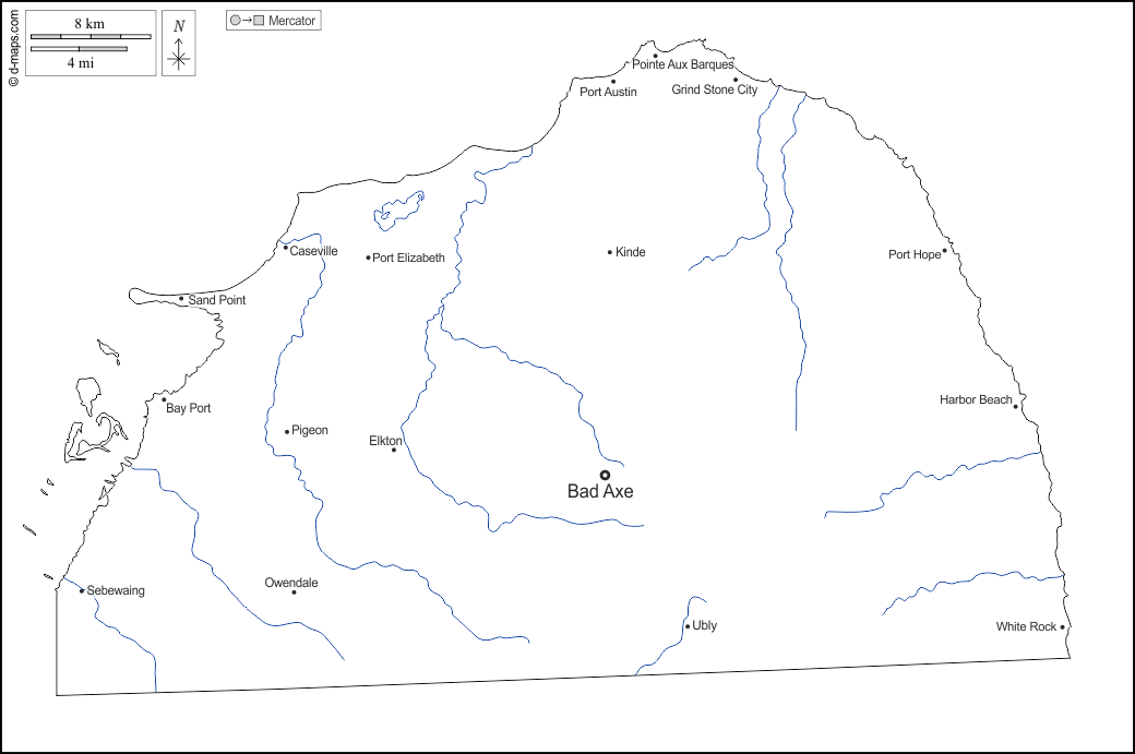 d-maps > Соединённые Штаты Америки > Мичиган > Уезд Гурон > контур, гидрографии, Главные города, имена, Белый