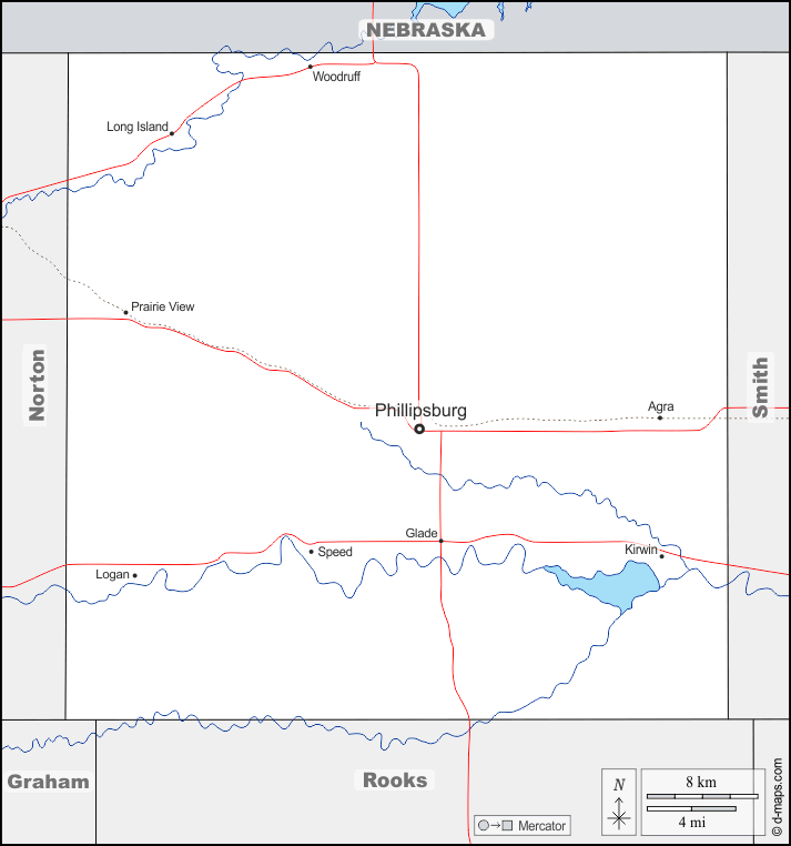 d-maps > Соединённые Штаты Америки > Канзас > Филлипс > границы, гидрографии, Главные города, дорог, имена