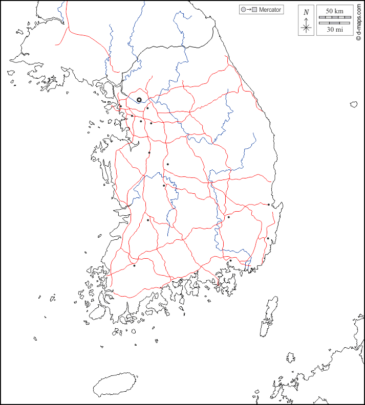 d-maps > Азия > Республика Корея > Республика Корея > границы, гидрографии, Главные города, дорог, Белый