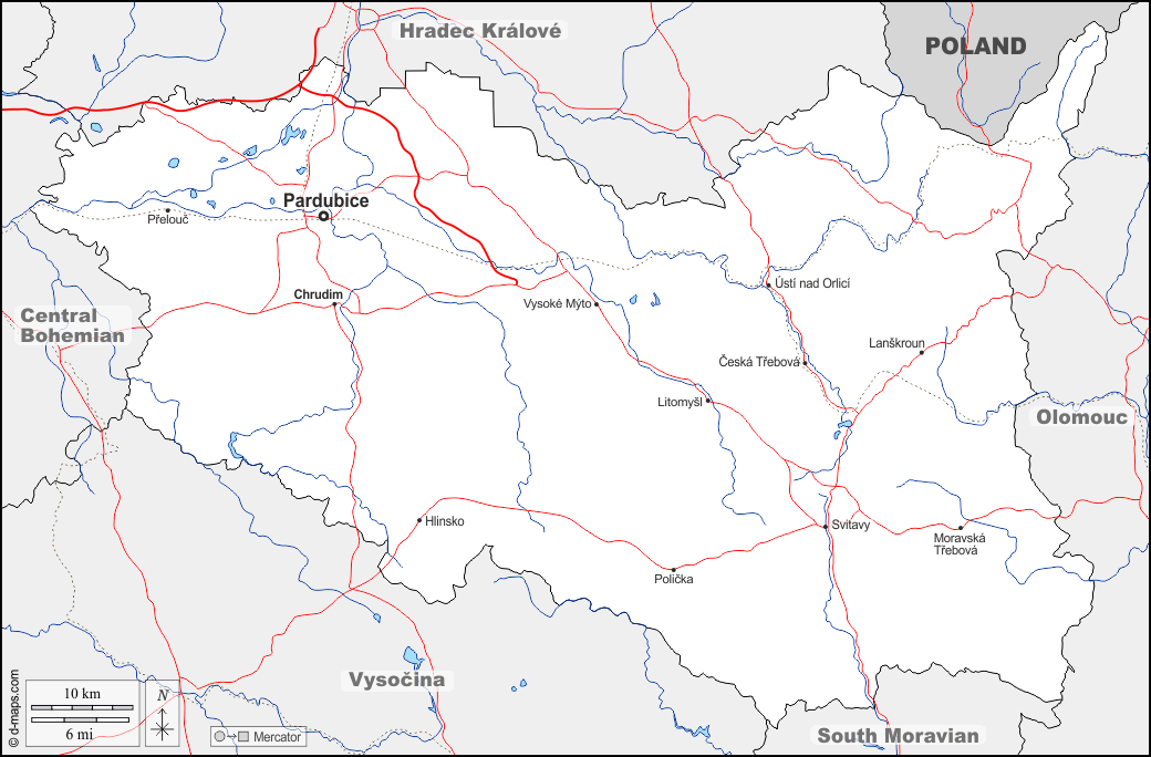 d-maps > Европа > Чехия > Пардубицкий край > границы, гидрографии, Главные города, дорог, имена