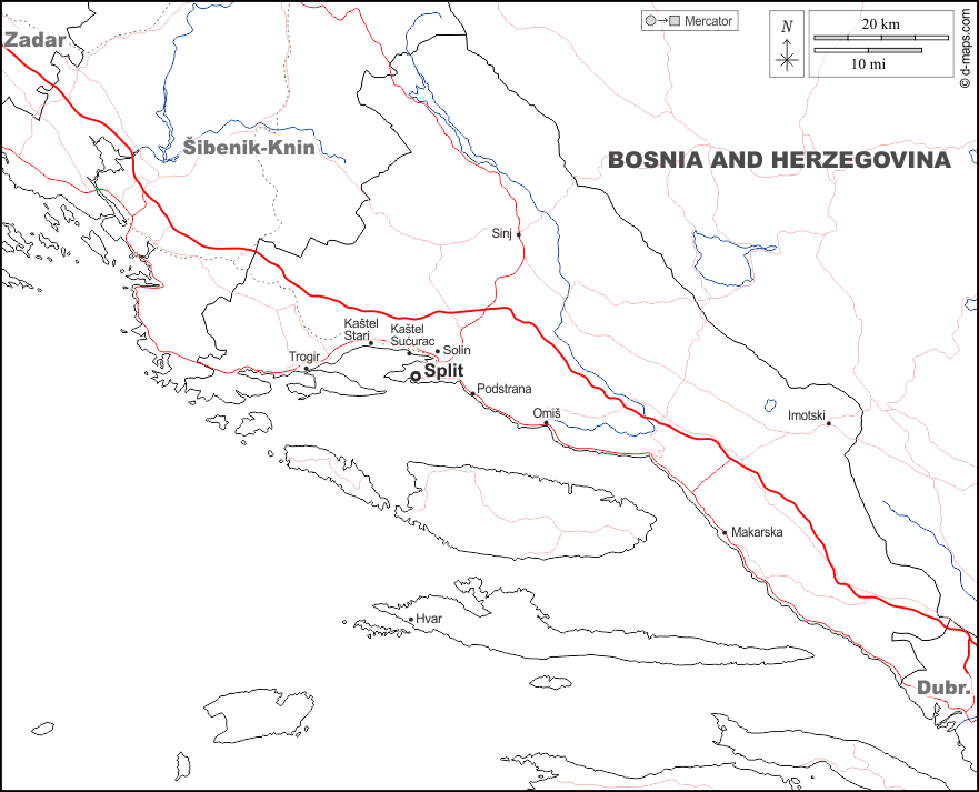 d-maps > Европа > Хорватия > Сплитско-Далматинска > границы, гидрографии, Главные города, дорог, имена, Белый