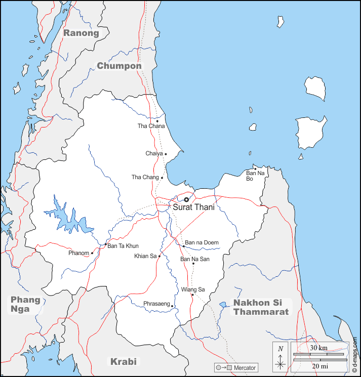 d-maps > Азия > Таиланд > Сураттхани > границы, гидрографии, Главные города, дорог, имена