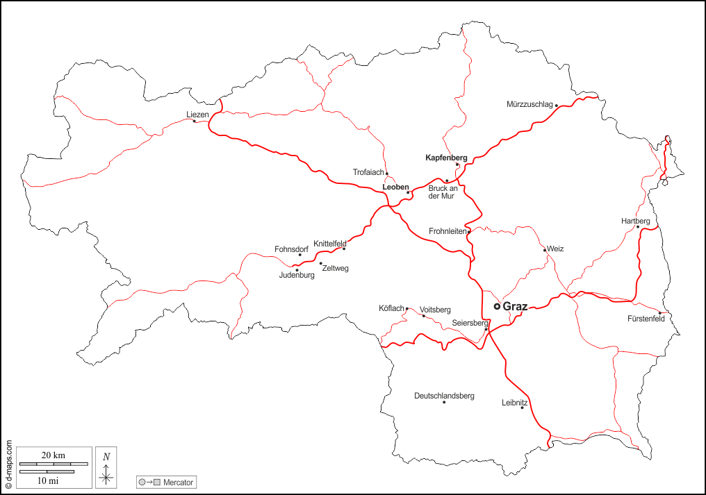 d-maps > Европа > Австрия > Штирия > контур, Главные города, дорог, имена, Белый