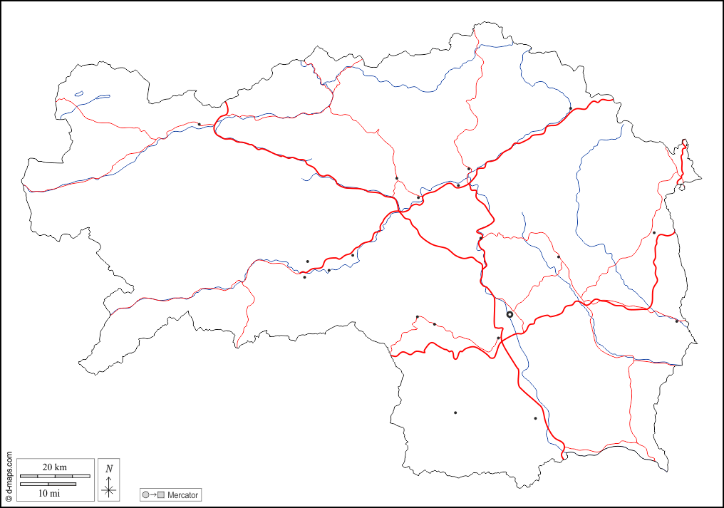 d-maps > Европа > Австрия > Штирия > контур, гидрографии, Главные города, дорог, Белый