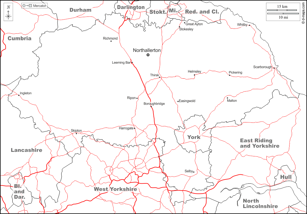 d-maps > 欧洲 > 英国 > 北约克郡 > 边界, 主要城市, 道路, 名称, 白