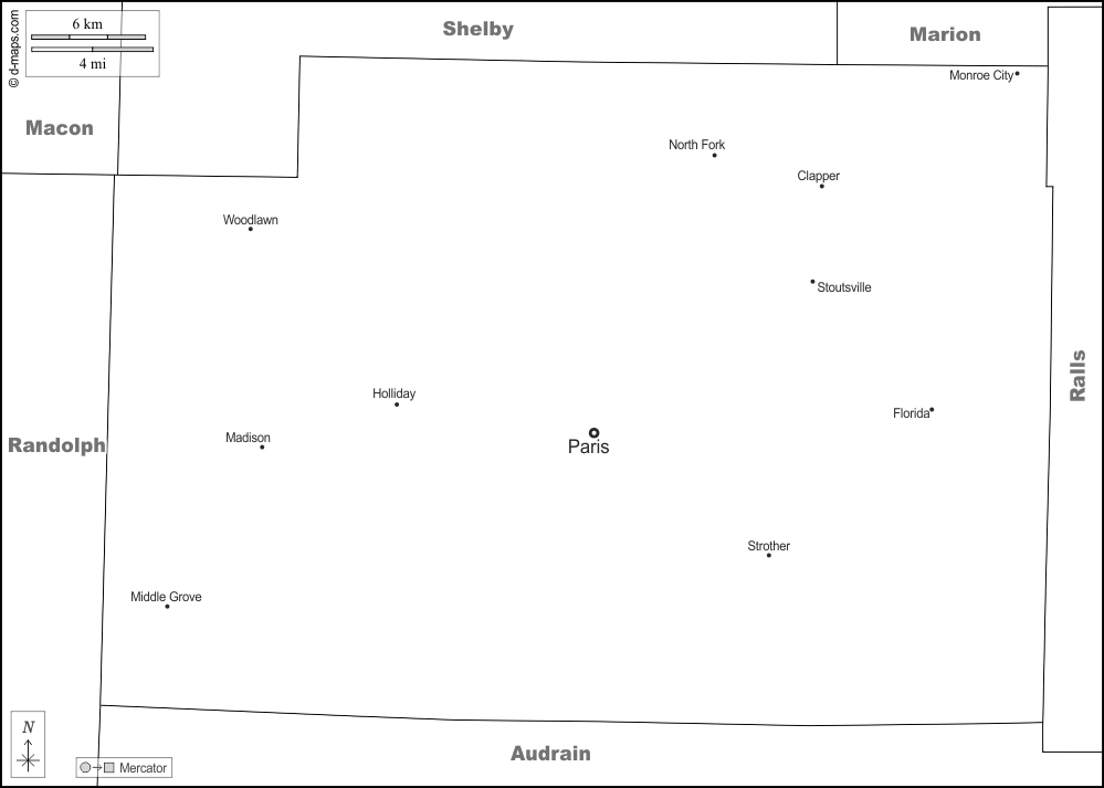d-maps > 美国 > 密苏里州 > 梦露县 > 边界, 主要城市, 名称, 白