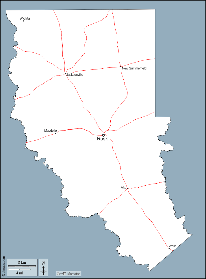 Alto, Jacksonville, Maydelle, New Summerfield, Rusk, Wells, Wichita.