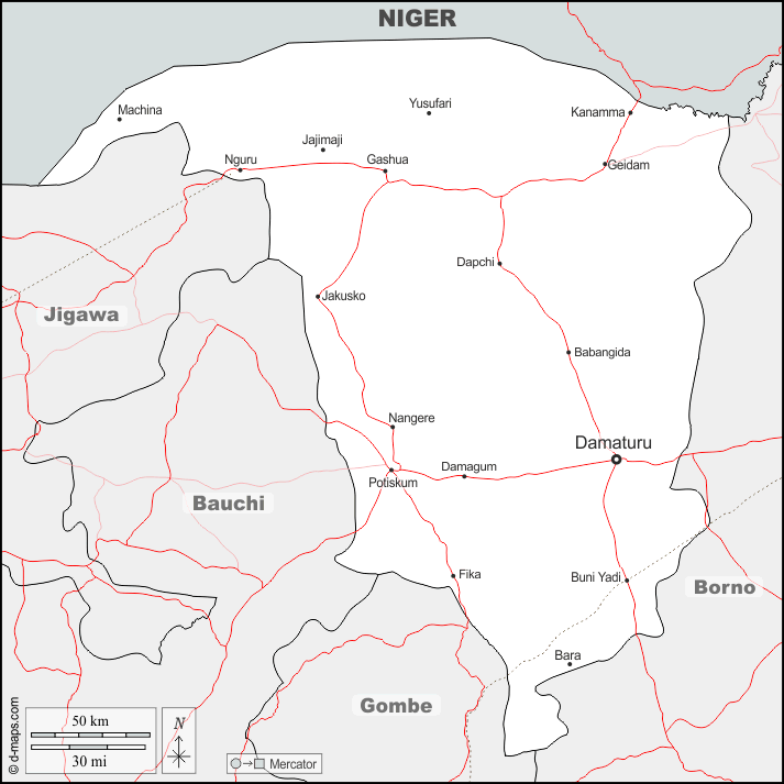 d-maps > 非洲 > 奈及利亞 > 约贝州 > 边界, 主要城市, 道路, 名称