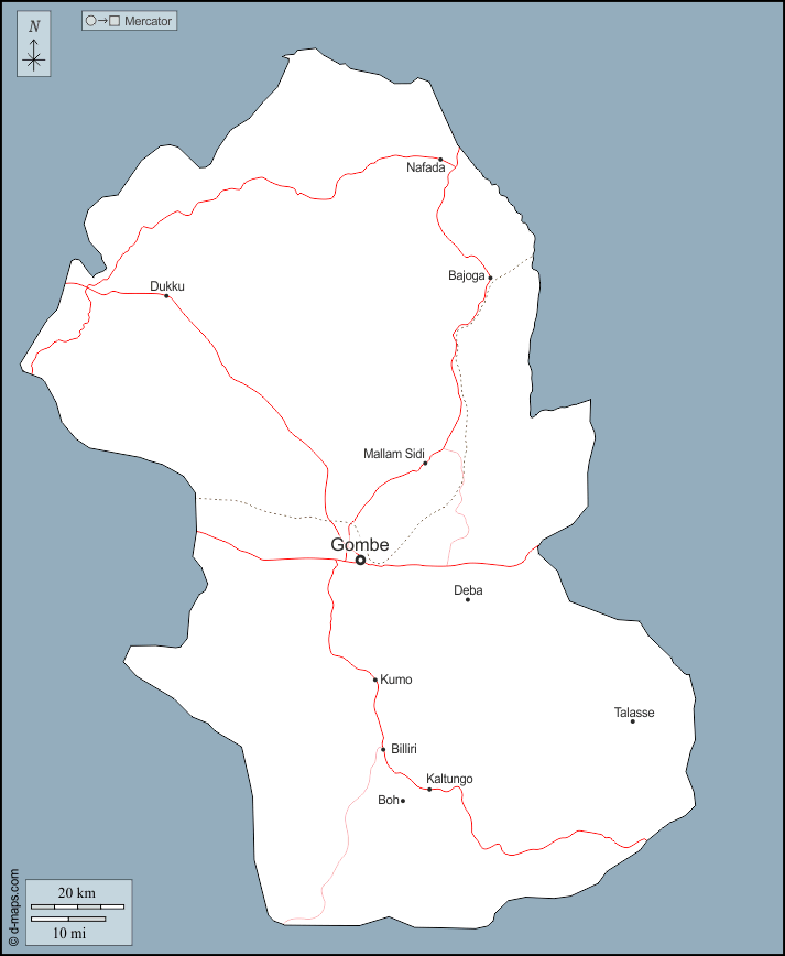Bajoga, Billiri, Boh, Deba, Dukku, Gombe, Kaltungo, Kumo, Mallam Sidi, Nafada, Talasse.