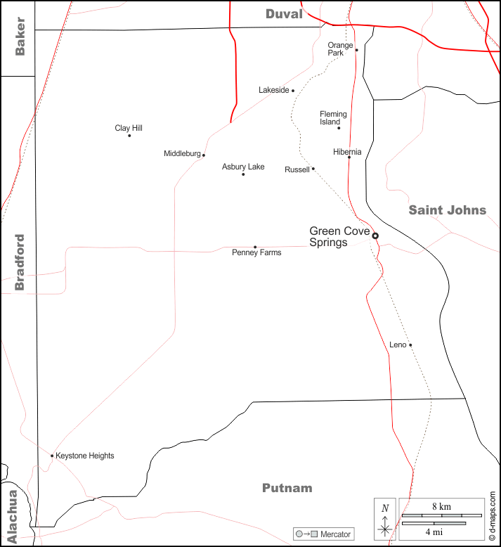d-maps > 美国 > 佛罗里达州 > 克莱县 > 边界, 主要城市, 道路, 名称, 白