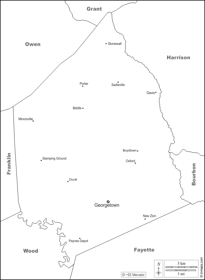 d-maps > 美国 > 肯塔基州 > 斯科特县 > 边界, 主要城市, 名称, 白