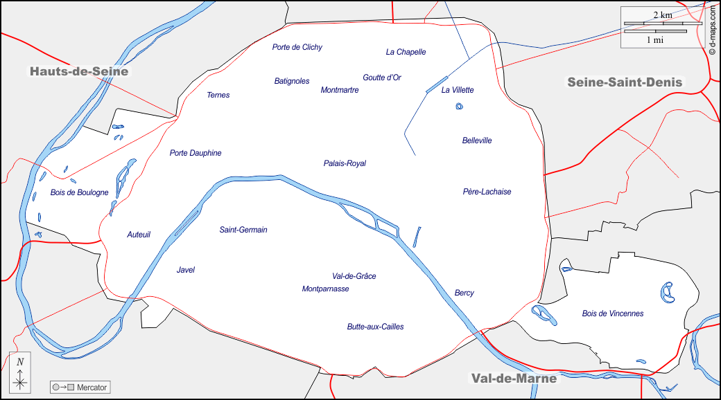 d-maps > 欧洲 > 法国 > 巴黎 > 边界, 水文学, 社区, 道路, 名称