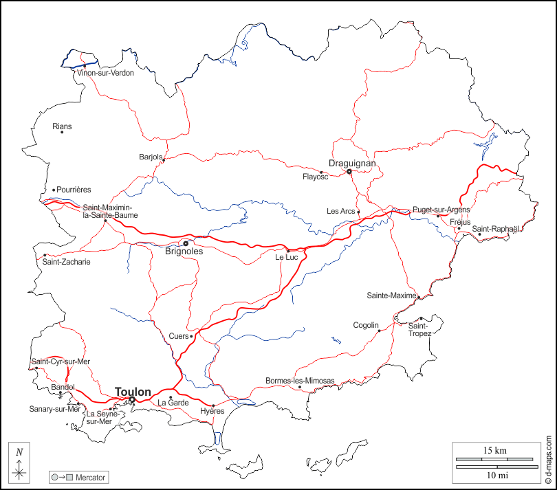 d-maps > 欧洲 > 法国 > 瓦尔省 > 大纲, 水文学, 主要城市, 道路, 名称, 白