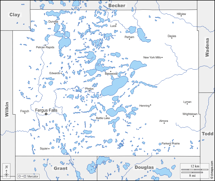 Almora, Basswood, Battle Lake, Davies, Dunvilla, Edwards, Fergus Falls, French, Henning, Hillview, Luce, Lyman, New York Mills, Parkers Prairie, Pelican Rapids, Perham, Phelps, Squier, Wrightstown.
