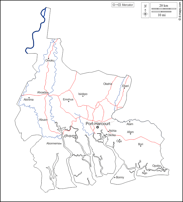 d-maps > 非洲 > 奈及利亞 > 河流州 > 大纲, 水文学, 主要城市, 道路, 名称, 白