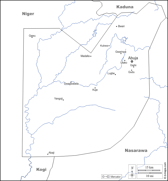 d-maps > 非洲 > 奈及利亞 > 阿布贾 > 边界, 水文学, 主要城市, 名称, 白