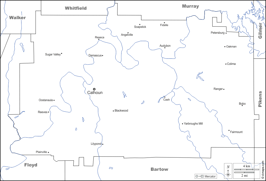 d-maps > 美国 > 喬治亞州 > 戈登县 > 边界, 水文学, 主要城市, 名称, 白