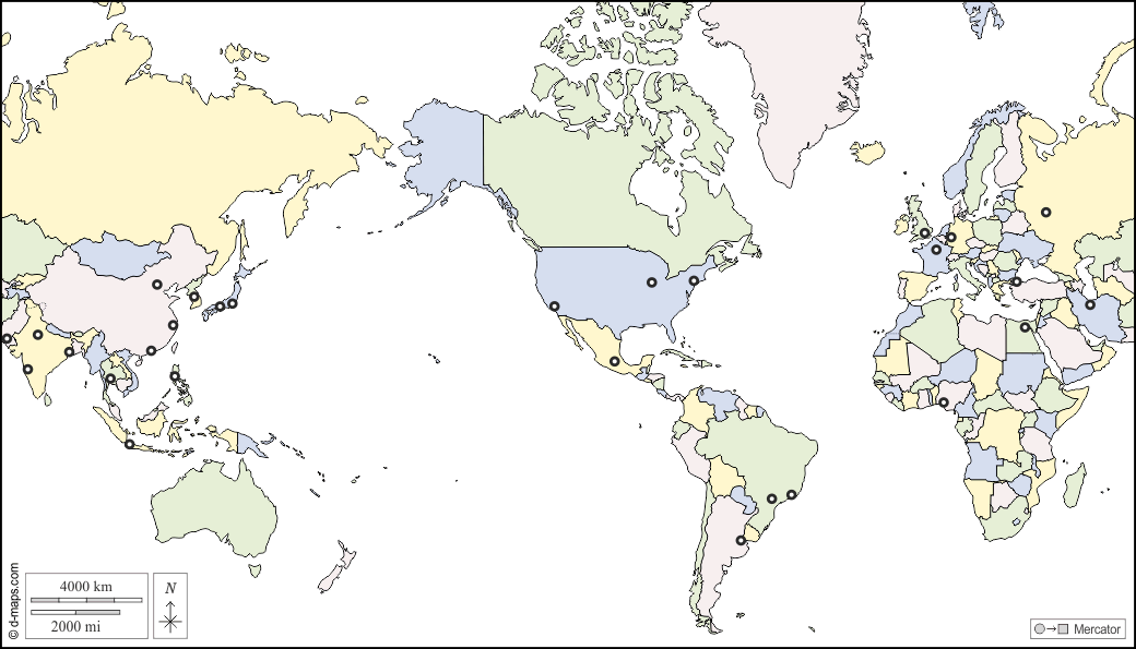 d-maps > 世界和海洋 > 世界计划圈(美洲) > 国家, 主要城镇, 颜色, 白