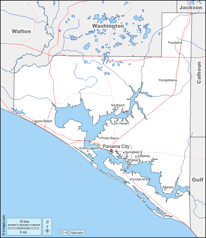 d-maps > 美国 > 佛罗里达州 > 湾郡 > 边界, 水文学, 主要城市, 道路, 名称