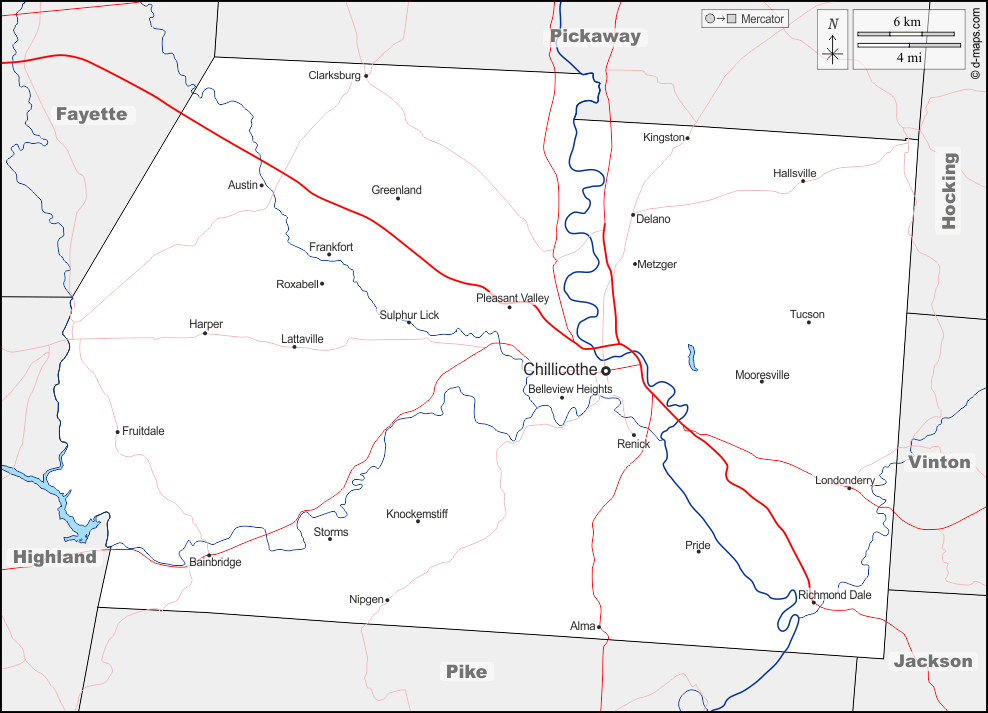 d-maps > 美国 > 俄亥俄州 > 罗斯县 > 边界, 水文学, 主要城市, 道路, 名称