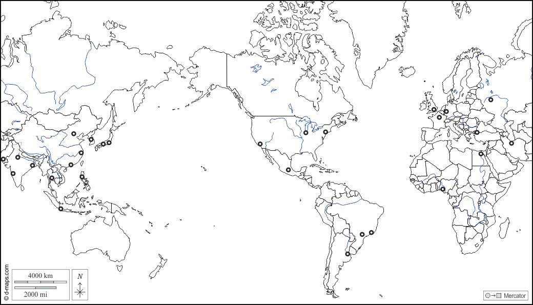 d-maps > 世界和海洋 > 世界计划圈(美洲) > 水文学, 国家, 主要城镇, 白