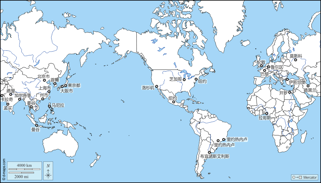 d-maps > 世界和海洋 > 世界计划圈(美洲) > 水文学, 国家, 主要城镇, 名称