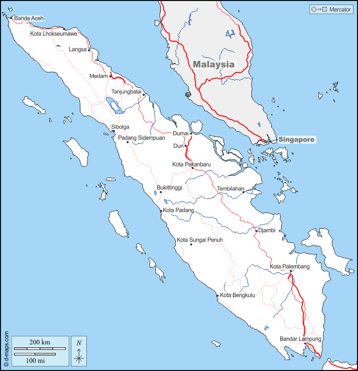 d-maps > 亚洲 > 印度尼西亚 > 蘇門答臘 > 边界, 水文学, 主要城市, 道路, 名称