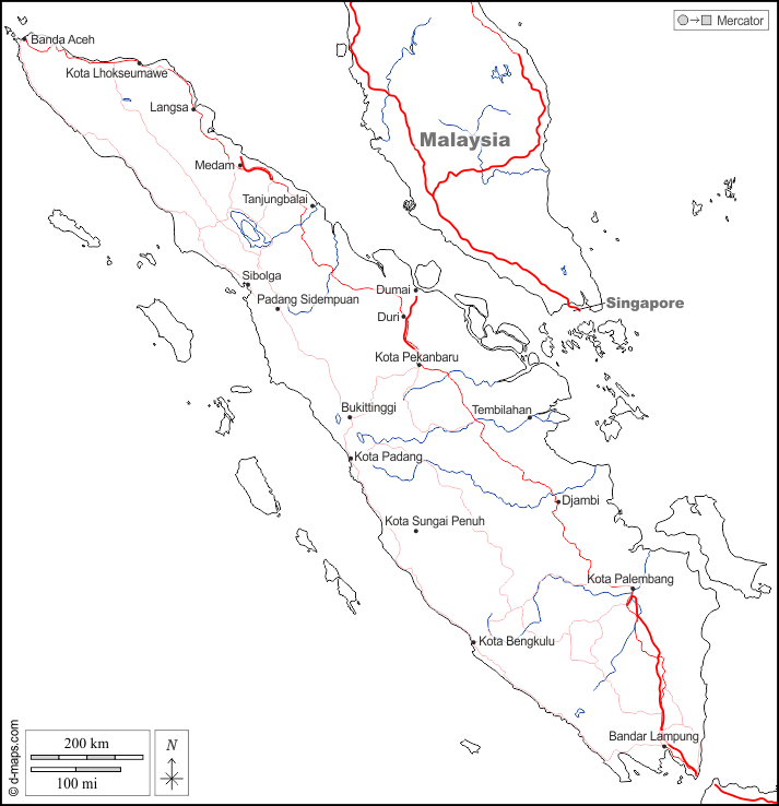 d-maps > 亚洲 > 印度尼西亚 > 蘇門答臘 > 边界, 水文学, 主要城市, 道路, 名称, 白