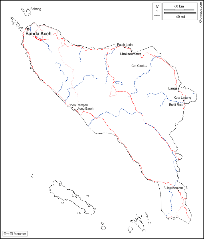 d-maps > 亚洲 > 印度尼西亚 > 亞齊特區 > 大纲, 水文学, 主要城市, 道路, 名称, 白