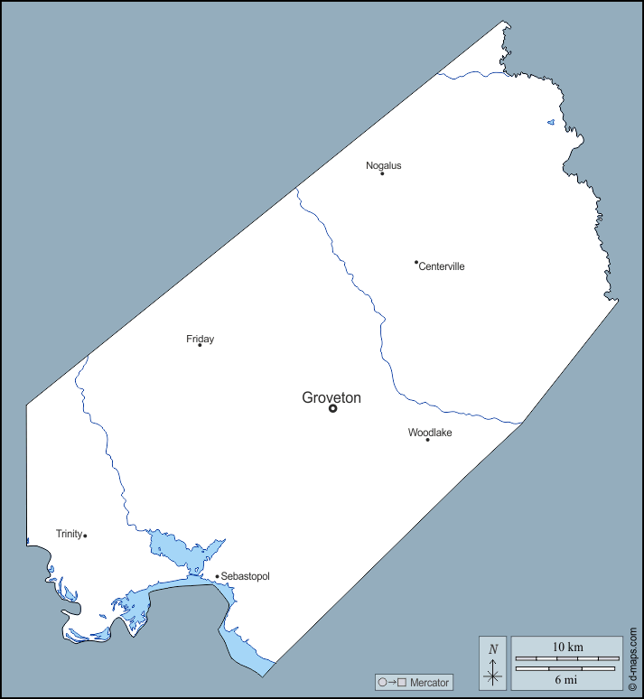 Centerville, Friday, Groveton, Nogalus, Sebastopol, Trinity, Woodlake.